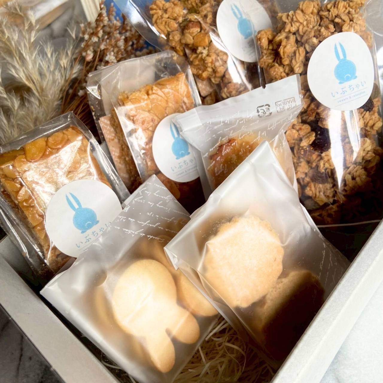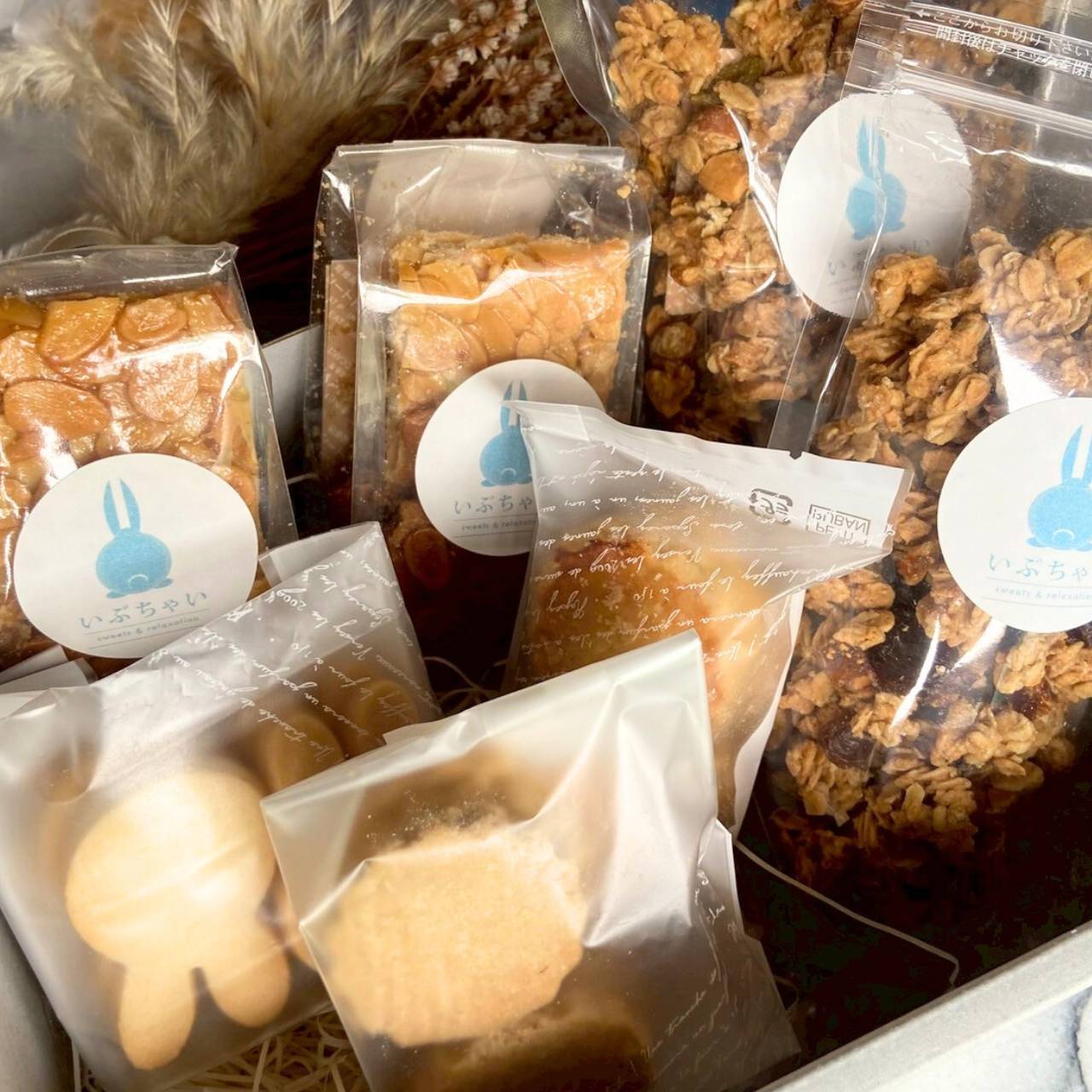 グラノーラ 150g、グラノーラ 90g、いぶちゃいクッキー(レモン風味)、さつまいもクッキー、ガレット・ブルトンヌ、フロランタン(2個)